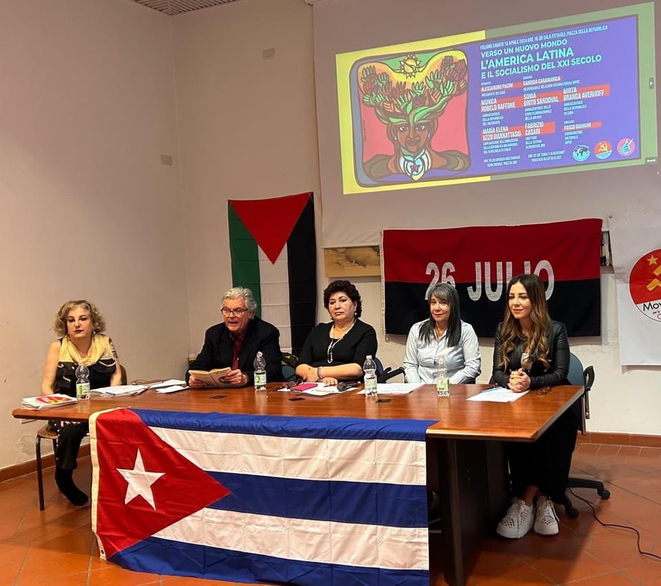 “Per tutto questo – ha concluso tra un grande e prolungato applauso Giannini – sia per il contributo volto ad accumulare forze internazionali nel fronte antimperialista, che per il contributo teorico volto a dare nuova vita all’esangue movimento rivoluzionario italiano ed europeo, per tutto questo, per ciò che rappresentano, ringraziamo le Ambasciatrici dei Paesi rivoluzionari dell’America latina che hanno voluto, oggi, essere con noi!”.