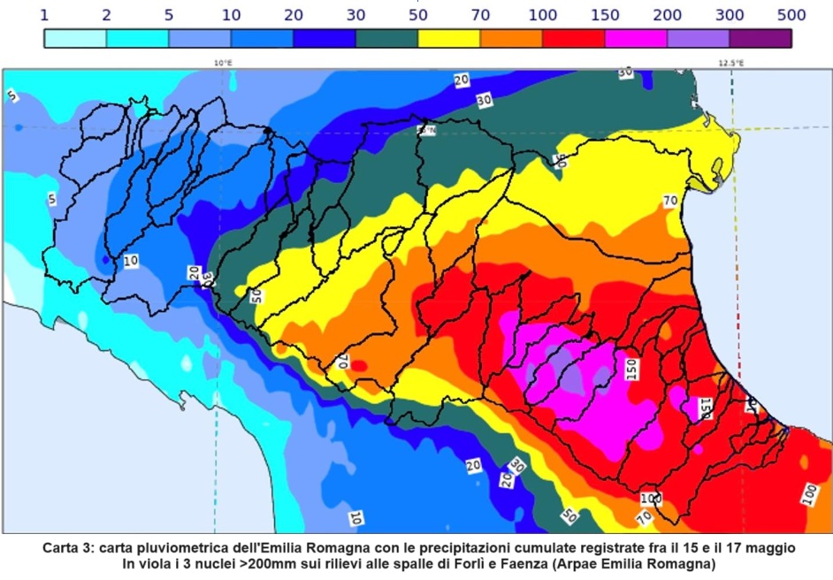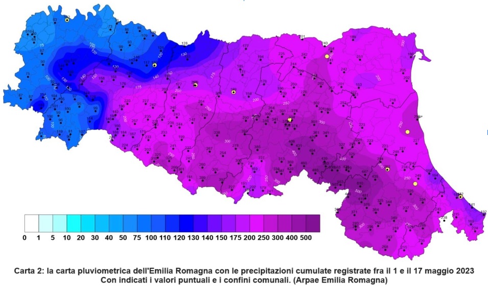 I bollettini meteo riferiscono che fra il 1 e il 17 maggio, in Emilia Romagna, sono caduti mediamente dai 300 ai 400 mm di pioggia, con picchi di 400-500 mm nel bolognese e in Romagna (carta 2), una quantità eccezionale corrispondente a circa la metà delle precipitazioni medie annue che nella pianura emiliano-romagnola si attestano intorno ai 900 mm.