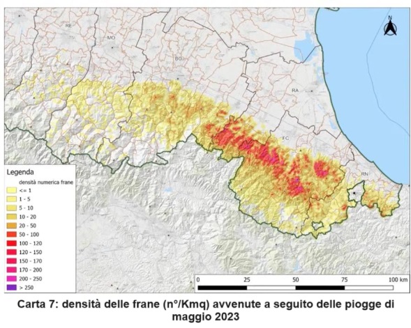 L’esaustivo e completo documento pubblicato il 15 dicembre 202317, dalla Commissione tecnica coordinata dal prof Alfredo Brath su incarico della giunta Bonaccini, evidenzia come le inondazioni generate dall’esondazione di 23 corsi d’acqua avevano interessato una superficie di 540 kmq, causato 65.598 frane (carta 7) e danneggiato 1950 infrastrutture stradali, pari al 3,6% dell’intero reticolo stradale delle 6 province coinvolte.