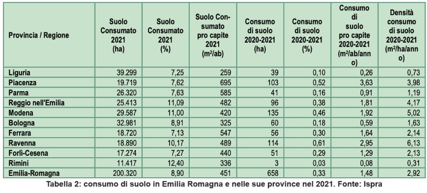 Una tendenza in atto da decenni che veniva confermata anche nel 2021, quando con un consumo di suolo annuo di 658 ha, pari al 10,5% dell’incremento nazionale (6.331 ha), l’Emilia Romagna è risultata la terza regione per nuove aree cementificate dopo Lombardia (883 ha) e Veneto (684 ha).