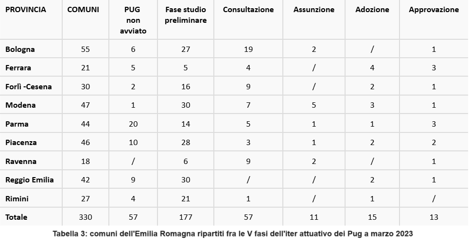 Il dossier Consumo di suolo 2023 in Emilia-Romagna, pubblicato da Legambiente il 14 giugno del 202315, analizza, a cinque anni dalla sua entrata in vigore, gli effetti della legge urbanistica regionale 24/2017 alla luce dell’approvazione dei Piani Urbanistici Generali (Pug), l’unico strumento normativo di cui le amministrazioni comunali sono chiamate a dotarsi per la gestione sistemica del territorio e il contenimento della cementificazione. Dai dati pubblicati rileviamo come, nonostante l’approvazione dei Pug sia stata prorogata al 1 gennaio 2022 e l’entrata in vigore al 1 gennaio 2024, il processo di adeguamento degli strumenti di pianificazione territoriale risulti ancora molto arretrato. A marzo del 2023, infatti, dei 330 comuni della Regione Emilia-Romagna solo 13 avevano approvato i Pug, mentre ben 177 risultavano ancora in “fase di studio preliminare”, dedotta almeno dall’acquisizione della cartografia necessaria alla stesura dei Piani stessi, con addirittura 57 che non avevano ancora provveduto a richiederla, non avendo in sostanza nemmeno avviato il Piano. I restanti 83 comuni invece si suddividevano fra le varie fasi dell’iter che portano all’approvazione (tab. 3).