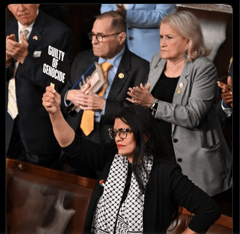 Per concludere, vale la pena citare, per la forte simbologia del gesto, il momento che ha visto protagonista la deputata Rashida Tlaib: mentre tanti suoi colleghi si alzavano per applaudire, lei rimaneva seduta esibendo un piccolo cartello con le scritte “WAR CRIMINAL” (criminale di guerra) e “GUILTY OF GENOCIDE” (colpevole di genocidio)”.