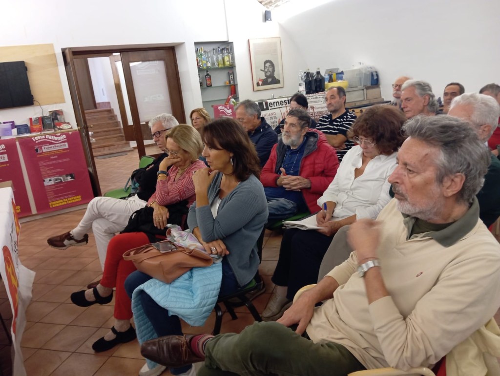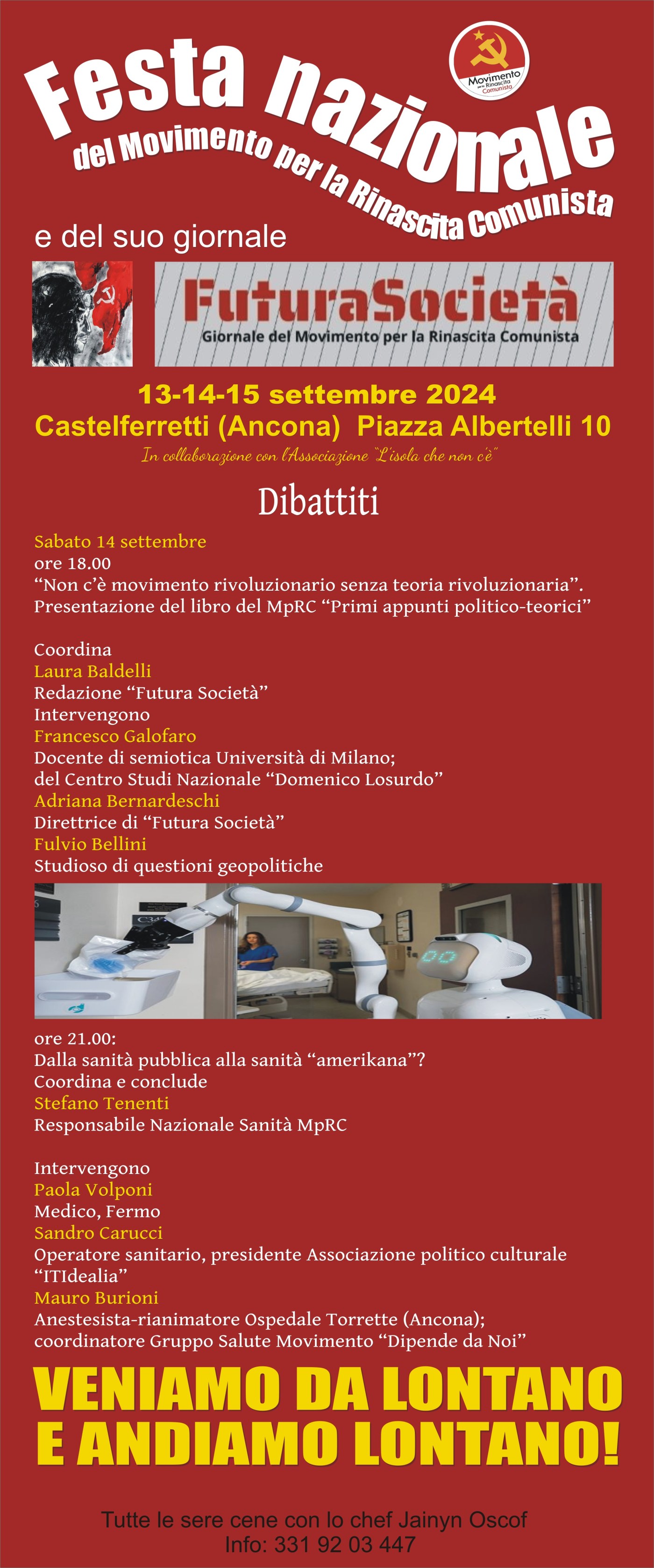 La pioggia non ha dato scampo alla prima giornata della festa nazionale (venerdì 13 settembre) del Movimento per la Rinascita Comunista e del suo giornale, «Futura Società», che si sta tenendo a Castelferretti, in provincia di Ancona, e che si prolungherà sino a domenica 15 settembre. I dibattiti, che avrebbero dovuto tenersi nella bella piazza alberata prospicente alla sede della festa, sono stati “spostati” (tavoli, seggiole, microfono, casse acustiche, bandiere, materiale politico), dall’intervento celere (sotto il temporale) dei militanti del MpRC, all’interno della sede, fortunatamente vasta, accogliente e dotata di cucina. La piazza avrebbe accolto meglio i tanti compagni e compagne, i cittadini, giunti alla festa per partecipare ai due dibattiti di venerdì 13 settembre e alla cena delle ore 20 che, come sempre in questa festa, anticipa il dibattito di chiusura delle ore 21/21.30. La sala interna ha, dunque, contenuto a malapena (e con una certa difficoltà, superata dalla “disciplina” degli astanti) “il pubblico” dei due dibattiti, il primo dei quali (ore 18.00) è stato su “Premierato e autonomia differenziata: l’attacco della destra e la lotta per la democrazia”.