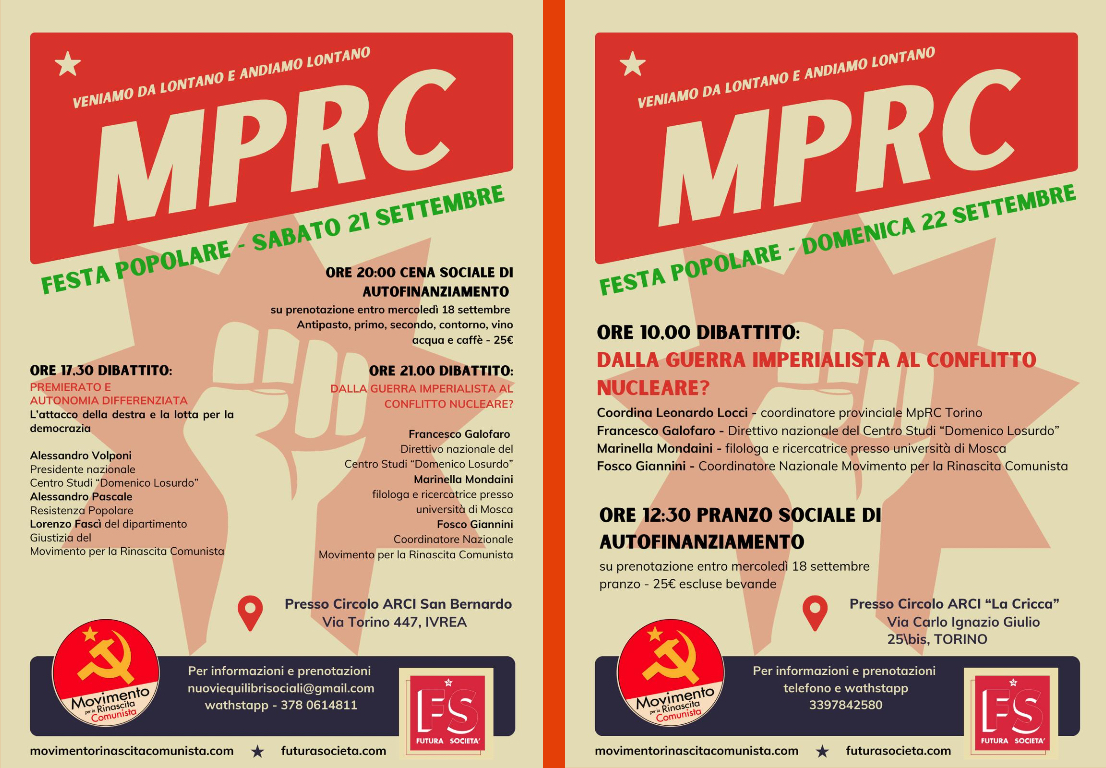 Il sabato, a Ivrea, presso il circolo Arci San Bernardo (via Torino 447), oltre a una cena sociale di autofinanziamento, sono previsti due dibattiti, uno il pomeriggio e uno la sera, il primo sul tema “Premierato e autonomia differenziata” (relatori Alessandro Volponi, presidente del Centro Studi “Domenico Losurdo”, Alessandro Pascale, di Resistenza Popolare, e Lorenzo Fascì, dipartimento Giustizia MpRC) , il secondo su “Dalla guerra imperialista al conflitto nucleare?” (relatori Francesco Garofalo, membro del direttivo nazionale del Centro Studi Losurdo, Marinella Mondaini, filologa e ricercatrice presso l’università di Mosca, e Fosco Giannini, coordinatore nazionale MpRC.