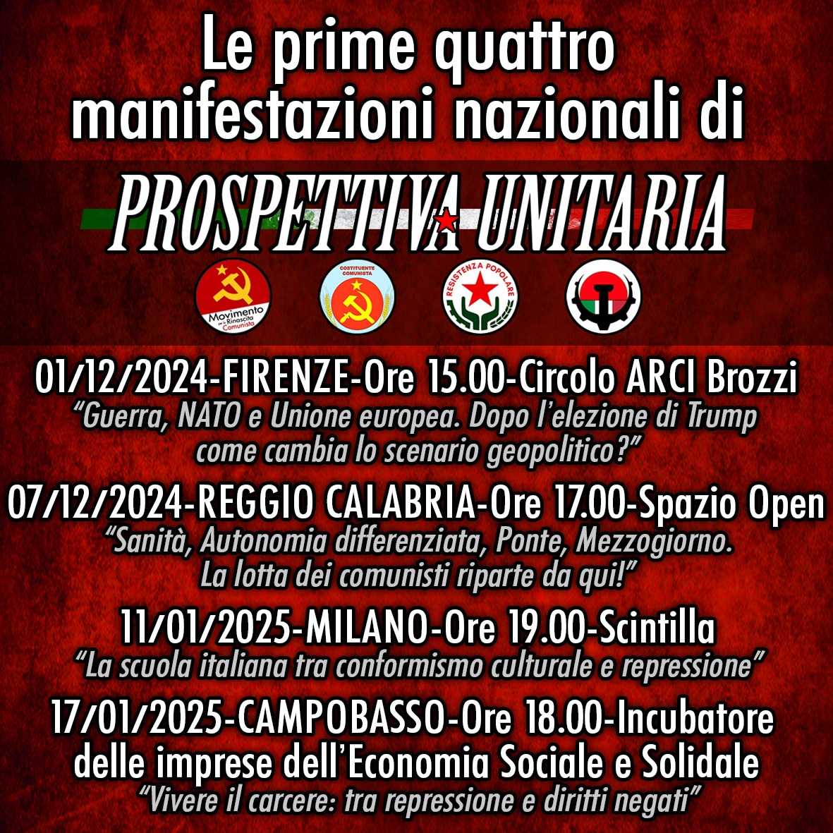 Prospettiva Unitaria (PU) mette la quarta. Il progetto comunista unitario formato da Resistenza Popolare, Patria Socialista, Movimento per la Rinascita Comunista e Costituente Comunista, che lavora, strategicamente, per la messa in campo di un’organizzazione comunista nazionale dalla natura antimperialista e rivoluzionaria e che si è presentata pubblicamente e ufficialmente attraverso la conferenza stampa tenutasi a Roma lo scorso 26 ottobre 2024, questo progetto comunista in transizione verso una forma organizzativa più alta e coesa e che, unita, è già presente in quasi tutto il territorio nazionale, questa nuova forza in movimento scende decisamente in campo attraverso quattro manifestazioni che si terranno – tra dicembre 2024 e gennaio 2025 – lungo tutto il territorio nazionale, quattro importanti appuntamenti che sfoceranno in una quinta iniziativa: un’assemblea nazionale a Roma il 25 gennaio 2025, attraverso la quale sarà ancor meglio delineato e presentato ai comunisti, alle forze antimperialiste, ai movimenti contro la guerra, alla classe operaia, ai lavoratori e agli intellettuali il progetto politico a medio/lungo termine della stessa Prospettiva Unitaria. Al fine di sottolineare ancor più la tensione unitaria delle quattro organizzazioni che compongono PU, si è deciso che ognuna di esse organizzerà una delle quattro manifestazioni in uno dei territori in cui è più organizzata e ha legami di massa, ma che in tutte e quattro le manifestazioni saranno presenti i segretari e i dirigenti di tutte le componenti di Prospettiva Unitaria. La prima delle quattro manifestazioni nazionali, questa organizzata da Resistenza Popolare, con la presenza di tutti i dirigenti nazionali di PU, si terrà domenica 1° dicembre a Firenze, presso il Circolo Arci, via di Brozzi 312, con inizio ore 15,00. Il titolo dell’iniziativa colloca immediatamente PU nell’assoluto vivo storico attuale: “Guerra, Nato e Unione europea. Dopo l’elezione di Trump come cambia lo scenario geopolitico?”. Una totale guerra imperialista, che segna di sé, da tempo, la fase che viviamo: vi è la guerra strategica degli Usa, della Nato e dell’Ue contro la Russia (guerra che si è ulteriormente drammatizzata e si è fatta già globale attraverso l’attacco diretto, con i missili nordamericani e britannici, sul territorio russo) e contro il nuovo assetto multipolare che si va, irrimediabilmente per il fronte imperialista, costituendo a livello planetario; vi è la guerra fascista di Israele, sostenuta a spada tratta dagli Usa con la complicità vigliacca dell’Ue, contro il popolo palestinese e per il controllo tirannico su quell’intera regione del mondo e vi è un’ strategia a livello mondiale dell’imperialismo Usa volta a ripristinare il decadente dominio nordamericano sul mondo, una strategia golpista e di guerra che va dalla lotta contro il Venezuela socialista di Maduro, contro Cuba, il Nicaragua e ogni Paese dell’America Latina che sceglie la strada della liberazione dal dominio imperialista Usa e quella della cooperazione col mondo Brics, sino all’impegno militare imperialista nel Mar Rosso e nell’Oceano Pacifico e nel Mar della Cina contro la Cina socialista. La domanda che pone la manifestazione di Firenze è questa, pesantemente cogente: quale nuovo quadro internazionale potrà costituirsi con l’Amministrazione Trump, vista la linea fortemente contraddittoria e comunque sempre imperialista che Trump già evoca? E cioè: sarà confermata, dalla nuova amministrazione Trump, la linea, appena suggerita, volta al riconoscimento della liceità della “scelta russa” espressa dai popoli della Crimea e del Donbass e dunque della fine della guerra in Ucraina attraverso un patto che ratifichi che Crimea e Donbass appartengano alla Russia e che l’Ucraina stessa non entri nella Nato e resti neutrale? Sarà confermata, da Trump, la scelta, già annunciata e questa tutta in negativo, di un attacco al Venezuela di Maduro ed il sostegno alle politiche fasciste di Israele, assieme alla già ben nota guerra doganale, in primis contro la Cina e poi contro la stessa l’Unione europea, che fa di Trump il nuovo paladino dell’isolazionismo imperialista nordamericano? Di tutto questo si parlerà a Firenze, il prossimo 1° dicembre 2024, nella prima manifestazione di PU, una discussione che avrà come sfondo strategico l’obiettivo della costruzione di un movimento di massa contro la guerra imperialista e per l’uscita dell’Italia dalla Nato e i compiti che dovranno svolgere i comunisti per cogliere questi obiettivi. La seconda manifestazione di PU, organizzata dal Movimento per la Rinascita Comunista, si svolgerà a Reggio Calabria sabato 7 dicembre, presso lo Spazio Open, via Filippini 25, con inizio ore 17.00. Già il titolo scelto per la manifestazione (“Sanità, Autonomia differenziata, Ponte, Mezzogiorno/ La lotta dei comunisti riparte da qui!”) rivela esattamente la cifra politica del progetto strategico di Prospettiva Unitaria, volto ad unire, radicare ed organizzare i comunisti nelle lotte, nella realtà concreta delle cose, nella società e tra i lavoratori. La lotta per la difesa ed il rilancio della Sanità pubblica, specie nel Sud d’Italia, specie in Calabria, dove per tenere aperti servizi fondamentali della devastata Sanità pubblica è stato necessario ricorrere all’opera di centinaia di medici cubani, è la prima questione che la manifestazione di Reggio Calabria di Prospettiva Unitaria vuole affrontare. Una lotta altrettanto determinata dovrà essere, innanzitutto dai comunisti uniti, lanciata contro l’Autonomia differenziata, un’orrenda merce di scambio tra una Lega sempre più volta a tornare ad un Paese feudale, ad una sempre più netta divisione tra un’Italia più benestante, del nord, e un’Italia ben più povera, del Sud, e Fratelli d’Italia di Giorgia Meloni, che punta ad un premierato come anticipazione di un regime autoritario, antidemocratico 