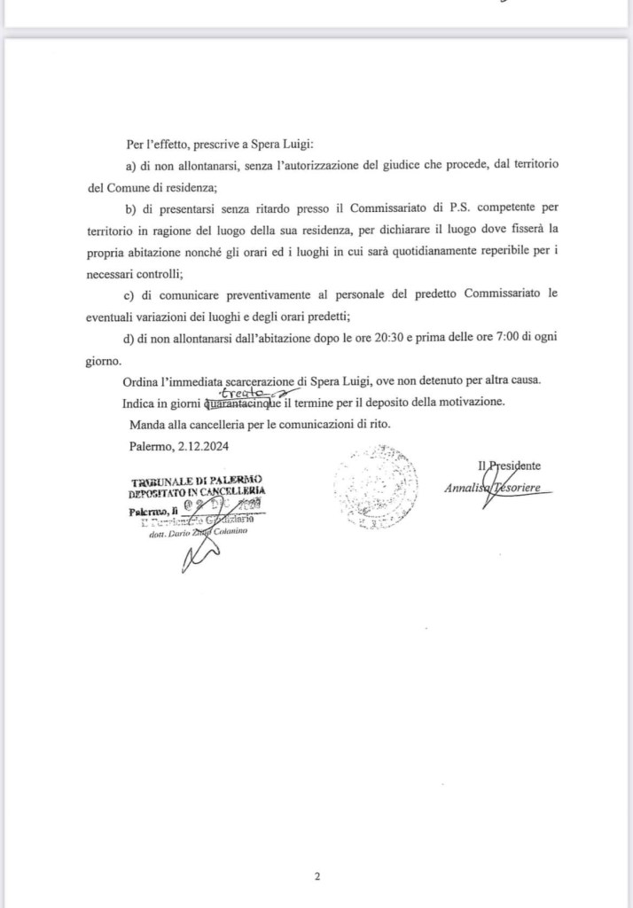 Così si espresso il suo avvocato difensore, Giorgio Bisagna: “A seguito dell’annullamento con rinvio della Corte di Cassazione, dell’ordinanza del Tribunale del Riesame di Palermo che aveva qualificato l’azione asseritamente ascritta a Luigi Spera (azione dimostrativa nei confronti della sede di Palermo della Leonardo spa) quale attentato terroristico, oggi il Tribunale del riesame ha rimesso in libertà Luigi, da più di 8 mesi in carcere in Alta Sicurezza ad Alessandria. Il reato è stato riqualificato in danneggiamento ed esclusa ogni aggravante terroristica. Il processo continua, intanto, in Corte d’Assise.”