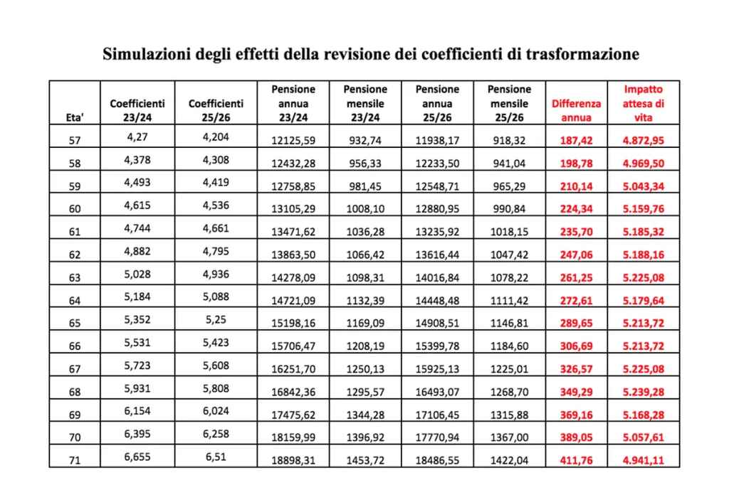 Ai fini dell’assegno pensionistico, visto che i contributi versati non torneranno di sicuro nelle tasche del lavoratore o lavoratrice che sia, vale il coefficiente di rivalutazione. Ebbene, la manovra di bilancio abbassa il coefficiente e se prima, a parità di anni versati, avrebbe preso 1.250 euro al mese, con il nuovo coefficiente invece, nel 2025-2026, percepirà un assegno da 1.225 euro, con una perdita di 25 euro al mese per tredici mensilità annue.