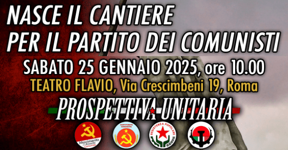 Il cantiere per la costruzione del Partito dei comunisti prende forma. A sancire l’avvio del percorso, dopo le quattro iniziative preparatorie del progetto di Prospettiva Unitaria, in corso di svolgimento, sarà la manifestazione nazionale prevista per il 25 gennaio a Roma, alle 10,00, presso il Teatro Flavio.
