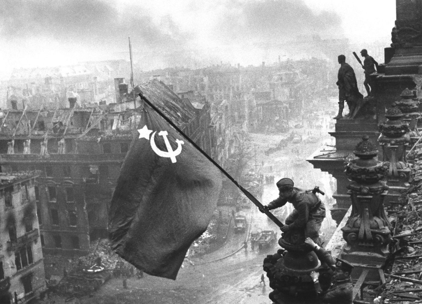 L’iconica fotografia dell’installazione della bandiera rossa sul Reichstag a Berlino, foto di Yevgeny Khaldei (https://it.wikipedia.org/wiki/La_Bandiera_della_Vittoria_sul_Reichstag#/media/File:Raising_a_flag_over_the_Reichstag.jpg)