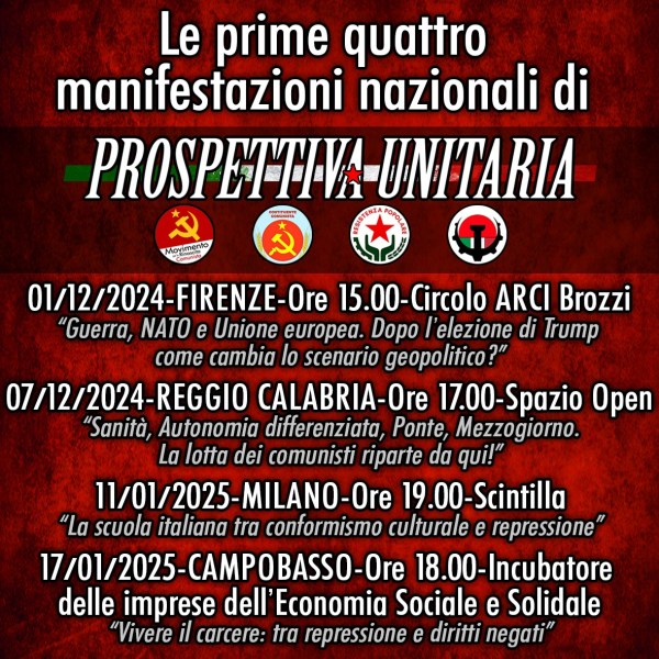 Le prime quattro manifestazioni nazionali del nuovo progetto politico promosso da Resistenza Popolare, Patria Socialista, Movimento per la Rinascita Comunista e Costituente Comunista, in vista dell’Assemblea nazionale del 25 gennaio 2025 a Roma. Prospettiva Unitaria (PU) mette la quarta. Il progetto comunista unitario formato da Resistenza Popolare, Patria Socialista, Movimento per la Rinascita Comunista e... Continua a leggere →