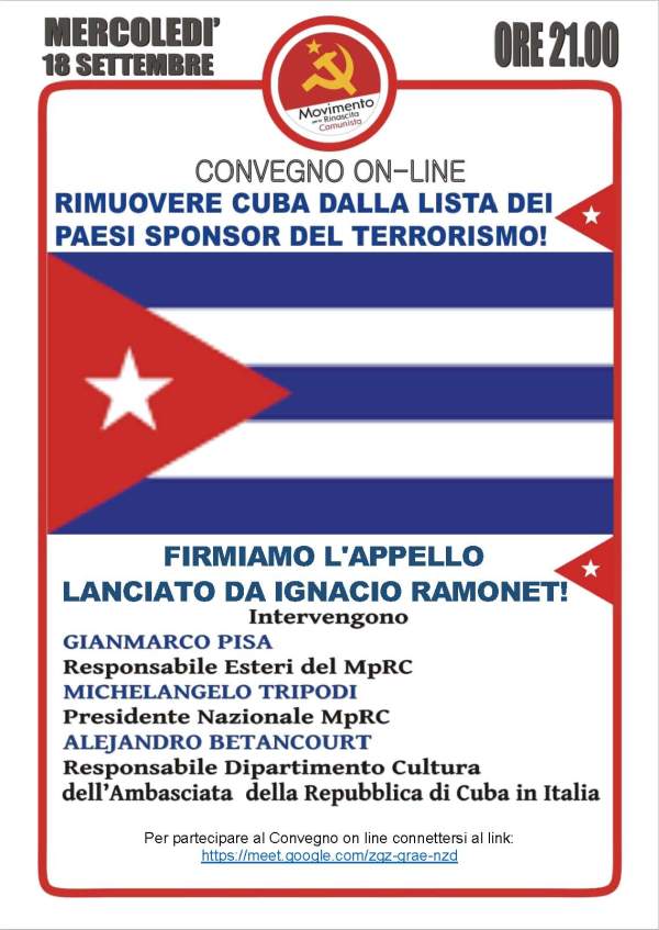 A cura del Dipartimento Esteri del MpRC Mercoledì 18 settembre, ore 21.00: convegno on-line promosso dal MpRC. Il Movimento per la Rinascita Comunista organizza, mercoledì 18 settembre alle ore 21, un importante convegno on-line in difesa di Cuba e della Rivoluzione Cubana. L’abbattimento dell’eroico e glorioso socialismo di Fidel Castro Ruz, di Ernesto “Che” Guevara,... Continua a leggere →