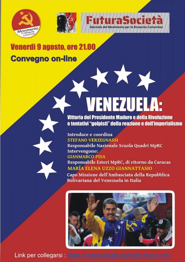 Venerdì 9 agosto ore 21: convegno on-line organizzato dal Movimento per la Rinascita Comunista (MpRC) sulle elezioni in Venezuela. Interverranno Marìa Elena Uzzo Giannattasio, Capo Missione dell’Ambasciata della Repubblica Bolivariana del Venezuela in Italia e Gianmarco Pisa, responsabile Esteri del MpRC di ritorno da Caracas, dove, invitato dal Psuv, ha fatto parte della commissione internazionale... Continua a leggere →