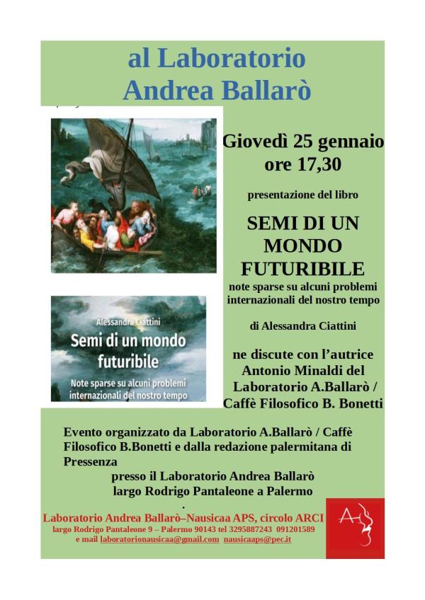 Il nuovo libro di Alessandra Ciattini, Semi di un mondo futuribile – note sparse su alcuni problemi internazionali del nostro tempo, verrà presentato a Palermo in un evento organizzato da Lavoratorio Andrea Ballarò /Caffè Filosofico B. Bonetti e dalla redazione palermitana di «Pressenza». L’evento si terrà giovedì 25 gennaio alle 17.30, presso Laboratorio Andrea ballarò... Continua a leggere →